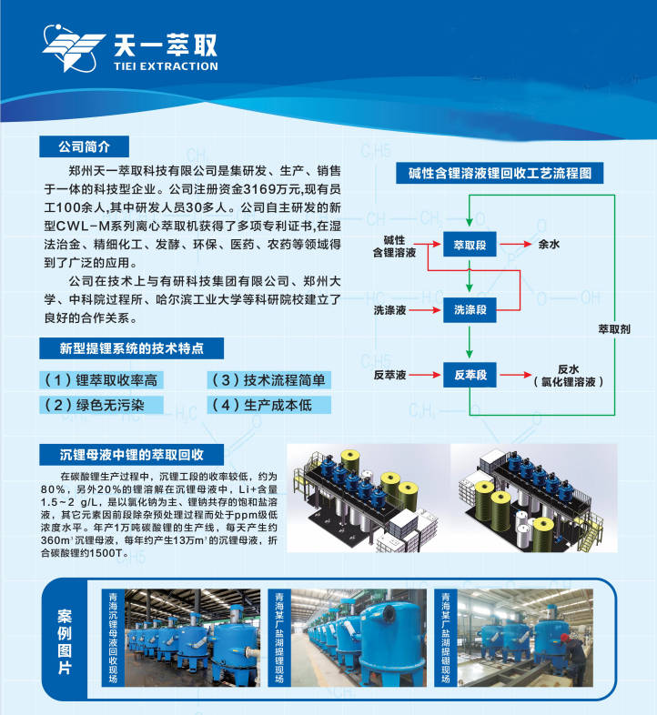 CWL-M离心萃取机是一款新型液液萃取分离设备,是针对传统离心萃取机弊端而开发,功耗只有传统环隙式机型的10%~30%。同时,离心萃取机具有级存留时间短、分相迅速、萃取效率高、耐腐蚀、节省投资费用和溶剂的回收再生费用等优点被应用在盐湖提锂中。